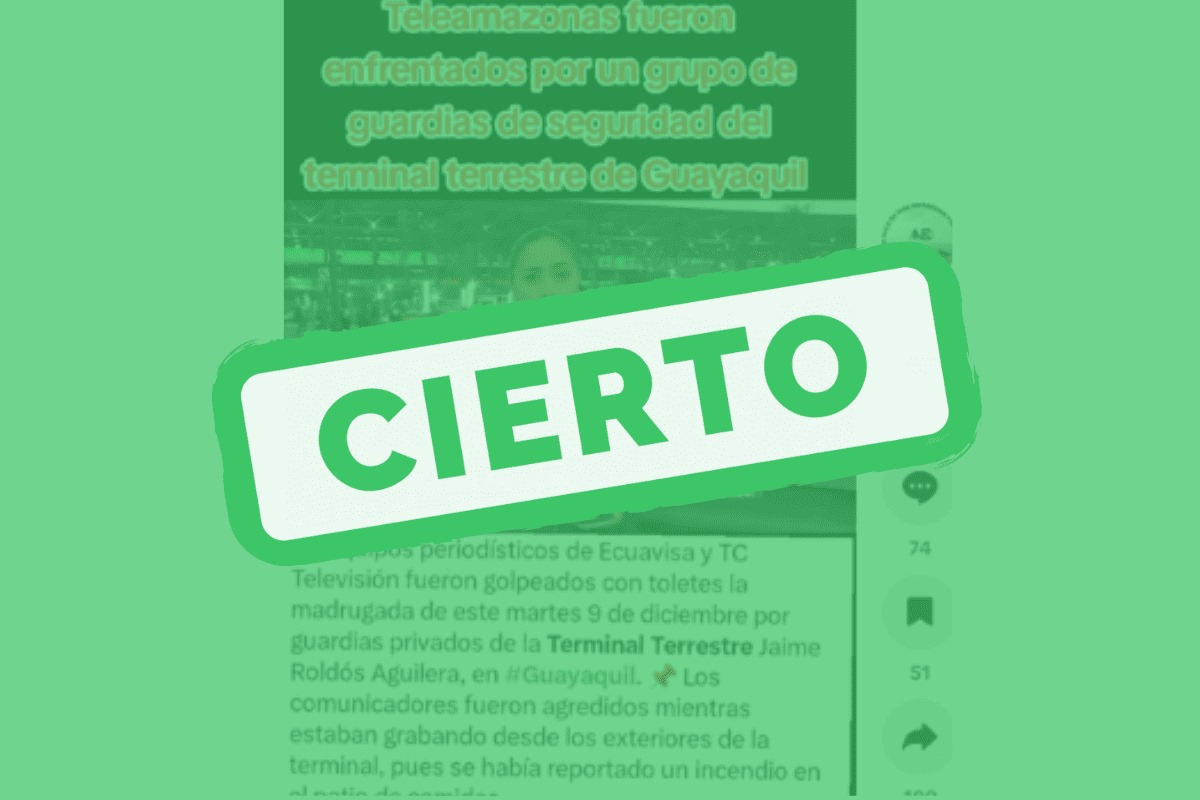 Tras contrastar la información con reportes periodísticos y declaraciones oficiales, el hecho es Cierto: periodistas de Ecuavisa y TC Televisión fueron agredidos con toletes por guardias privados en la Terminal Terrestre de Guayaquil mientras realizaban una cobertura.