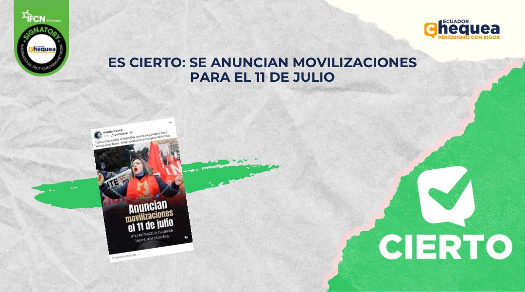 El tema ha generado varias publicaciones en redes sociales. Bajo ese contexto, un post en Facebook asegura que se anuncian movilizaciones para el 11 de julio. Se califica este contenido como cierto. La Unión Nacional de Educadores (UNE) y el Frente Popular tienen previsto manifestarse en contra del Gobierno de Daniel Noboa para esa fecha. Las organizaciones rechazan que hayan entrado en vigencia tres leyes que, según señalan, implican una regresión en los derechos laborales y promueven la persecución de activistas sociales.