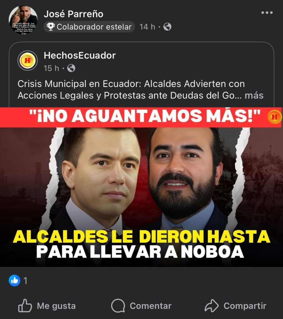 Un ejemplo de esto se puede encontrar en Facebook, donde en un grupo denominado ‘Revolución Ciudadana Oficial’ se comparte un contenido originalmente publicado por la página ‘Hechos Ecuador’, ambos recurrentes cuando de desinformación se trata; en el que se asegura que existe una crisis municipal en Ecuador y que alcaldes han advertido al Gobierno con acciones legales y protestas ante las deudas del Gobierno.