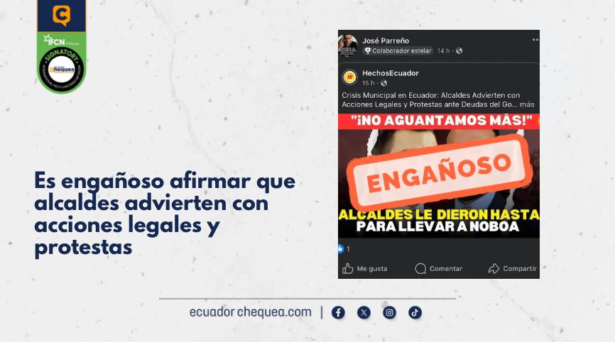 Sin embargo, esta información es engañosa. Si bien la AME denunció los problemas que han presentado por el retraso en los pagos y anunció el inicio de una acción ante la Corte Constitucional, no existe una convocatoria a protestas por parte de los representantes cantonales ni se ha emitido una advertencia formal.