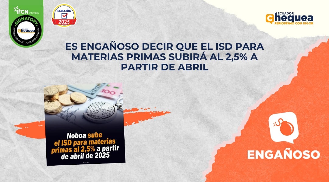Una publicación realizada en Facebook, por ejemplo, asegura que el presidente, Daniel Noboa, “sube el ISD para materias primas al 2,5% a partir de abril de 2025”. Calificamos este contenido como engañoso. El Gobierno plantea una reducción del 5% al 2,5% de este impuesto para materias primas desde abril de 2025. Sin embargo, hasta este año, las industrias no pagaban este impuesto por un crédito tributario aplicado al impuesto a la renta. Esto, según aseguran los gremios, podría verse como un aumento en el tributo y afectar a los costos de producción.