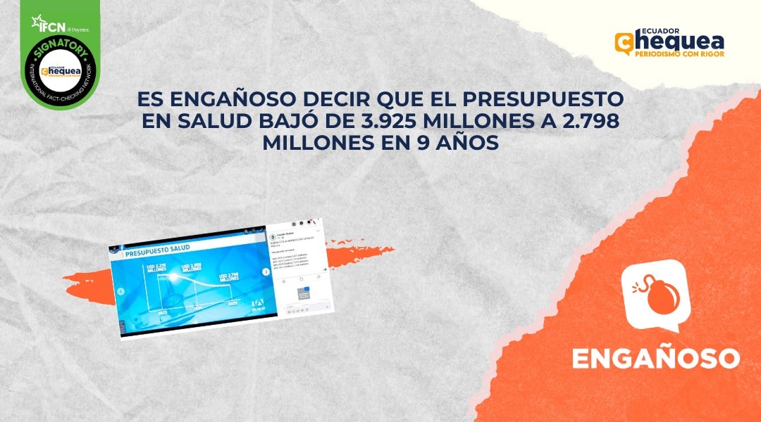 Al respecto, una publicación en Facebook asegura que el presupuesto de salud bajó de 3.219 millones a 2.798 millones en los últimos tres años y que en 2016, durante el gobierno de Rafael Correa, el presupuesto fue de 3.925 millones. Se califica este contenido como engañoso. El presupuesto de salud sí bajó durante estos años; sin embargo, se compara con el gobierno de Rafael Correa en 2016 y el dato es erróneo. Según los datos del Ministerio de Economía y Finanzas, en 2023 el presupuesto de salud fue de 3,21; en 2024, era de 2,95 millones; y para este año el presupuesto quedó en 2,8 millones. En 2016, con Correa en el poder, el presupuesto para Salud fue $2,3 millones; es decir hay una diferencia de $1,53 con lo que coloca el post.
