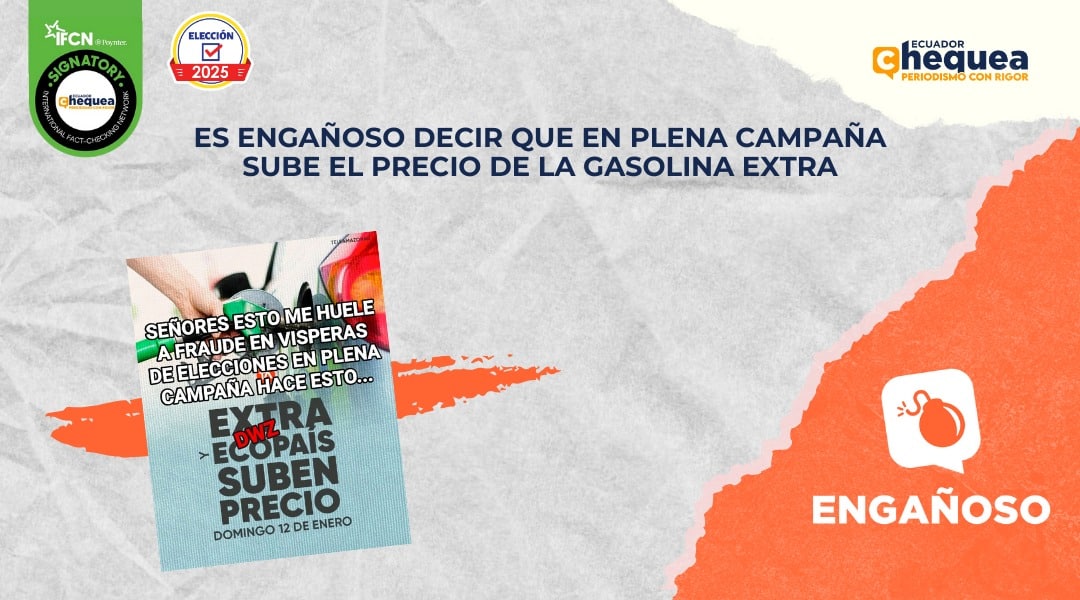 El tema también ha sido aprovechado por los desinformadores para hacer de las suyas. En Facebook, una publicación asegura que en plena campaña sube el precio de la gasolina extra. Se califica este contenido como engañoso. El precio de las gasolinas extra y ecopaís se actualiza el 12 de cada mes. Esto debido al sistema de bandas que regula los precios de estos combustibles y que se aplica desde hace 6 meses. Desde el 12 de enero, los precios del galón de extra y ecopaís subieron $ 0,07, mientras que la súper bajó $0,03. El nuevo precio fue anunciado por la Cámara Nacional de Distribuidores de Derivados del Petróleo (Camddepe).