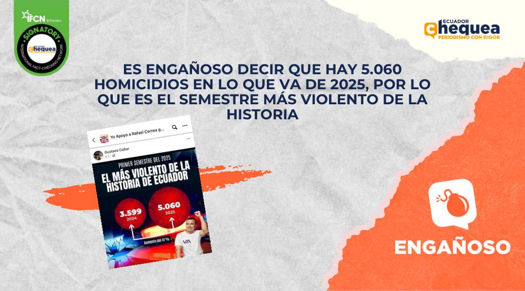 Al respecto, una publicación en Facebook asegura que el primer semestre de 2025 es el más violento de la historia, porque el primer semestre de 2024 hubo 3.599 asesinatos y en este 2025, 5.060; lo que representaría un aumento del 41%. Se califica este contenido como engañoso. Ecuador cerró el primer semestre de 2025 con 4.619 asesinatos, lo que representa un incremento del 19.63% en comparación con el mismo período de 2024, en donde hubo 3.861. La cifra de 2025 es, además, la más alta registrada desde 2014, en la que se tiene registros.