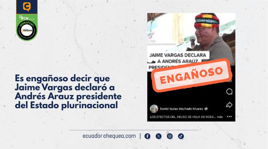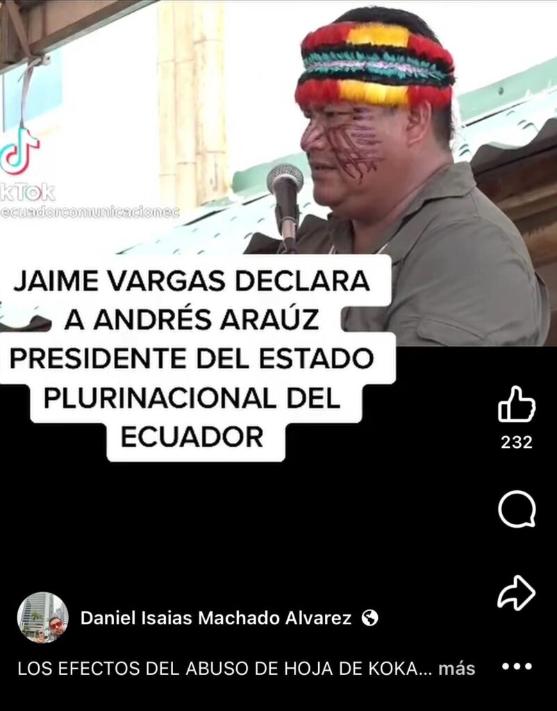 Una publicación realizada en Facebook, por ejemplo, asegura que Jaime Vargas declaró Presidente del Estado Plurinacional de Ecuador a Andrés Arauz, político y excandidato presidencial por la Revolución Ciudadana. Esta supuesta información alcanzó más de 232 reacciones en la red social.