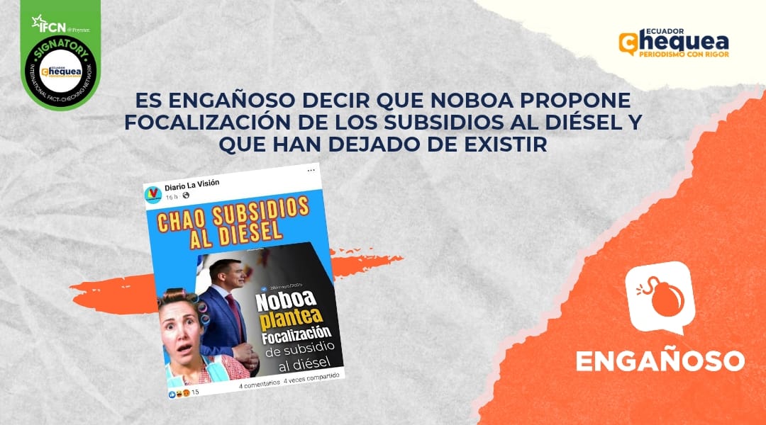 Al respecto, una publicación en Facebook afirma que el presidente, Daniel Noboa, propone eliminar los subsidios al diésel bajo el argumento de una focalización y que por eso los ecuatorianos deben despedirse de ellos. Se califica este contenido como engañoso. El contenido presenta un claro sesgo político y omite el contexto completo. En una entrevista, Noboa planteó una posible focalización del subsidio al diésel, pero dijo que esta medida no afectará a la ciudadanía en general. Además, hay un pedido formal de focalizar el subsidio al diésel. El Presidente analiza sustituir su uso con gas natural en algunos sectores.