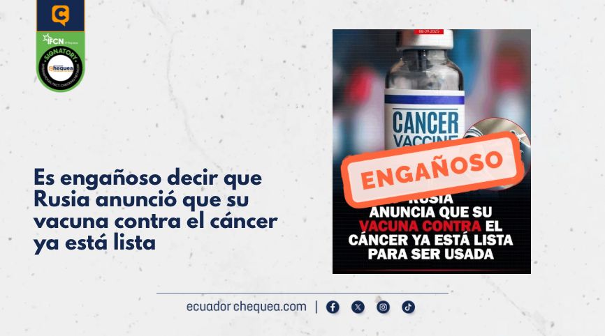 Estos avances, sin embargo, han sido aprovechados por los desinformantes para hacer de las suyas. Por ejemplo, una publicación en Facebook asegura que Rusia anunció que su vacuna contra el cáncer ya está lista para ser usada. Se califica este contenido como engañoso.