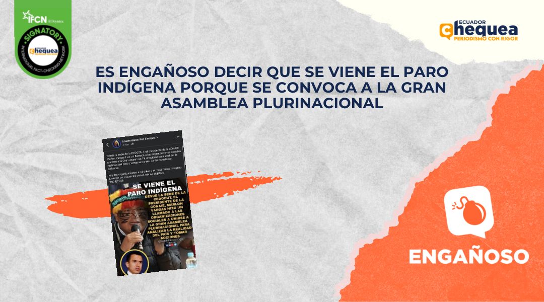 Un ejemplo de esto se ve en una publicación realizada en Facebook, en la que se asegura que en Ecuador “se viene el paro indígena”. Esto, utilizando una fotografía del presidente de la Conaie, Marlon Vargas, y del presidente, Daniel Noboa. Ecuador Chequea califica este contenido como engañoso. Si bien Vargas sí convocó a una Gran Asamblea Plurinacional en una declaración, no se ha anunciado o planificado jornadas de paralización nacional por parte de las organizaciones sociales.
