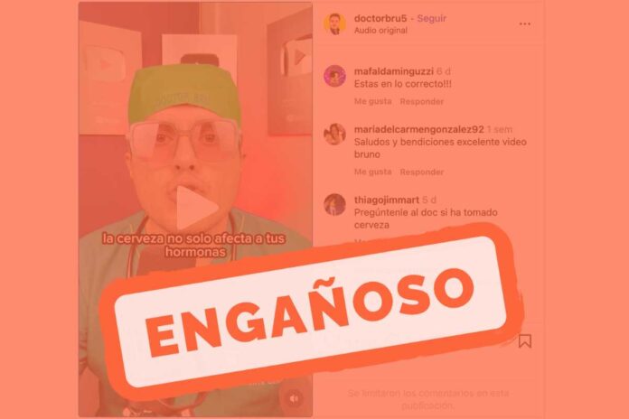 En redes sociales circula un video publicado por la cuenta de Instagram ‘doctorbru5’, en el que un hombre vestido con ropa médica asegura que la cerveza es “el peor alcohol” y que, al consumir una sola cerveza, los niveles de testosterona masculina caen de forma rápida y drástica, incluso por debajo de los niveles hormonales de una mujer.