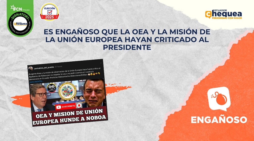 En este mar de publicaciones de todo tipo, la desinformación también ha sabido abrirse paso en los espacios digitales. Una publicación realizada en Threads, por ejemplo, asegura que la “OEA y la Misión de Observación de la Unión Europea hace fuerte crítica al Gobierno de Daniel Noboa por no respetar la Ley y no pedir licencia e ir en contra de la democracia en Ecuador”. Esto, en un video en el que se muestran algunas declaraciones de autoridades de la Misión de Observación Electoral, publicado en YouTube. Calificamos este contenido como engañoso. Los extractos que se usan en el video son reales, pero están sacados de contexto. En ningún momento los observadores electorales han señalado algo que hunda a Noboa.