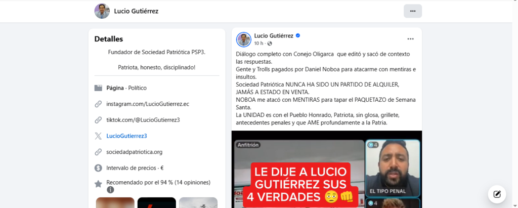 En Facebook circula una publicación que asegura que el expresidente Lucio Gutiérrez puso a disposición de Rafael Correa su partido político, Sociedad Patriótica (PSP), con el fin de enfrentar a Daniel Noboa en las elecciones seccionales.