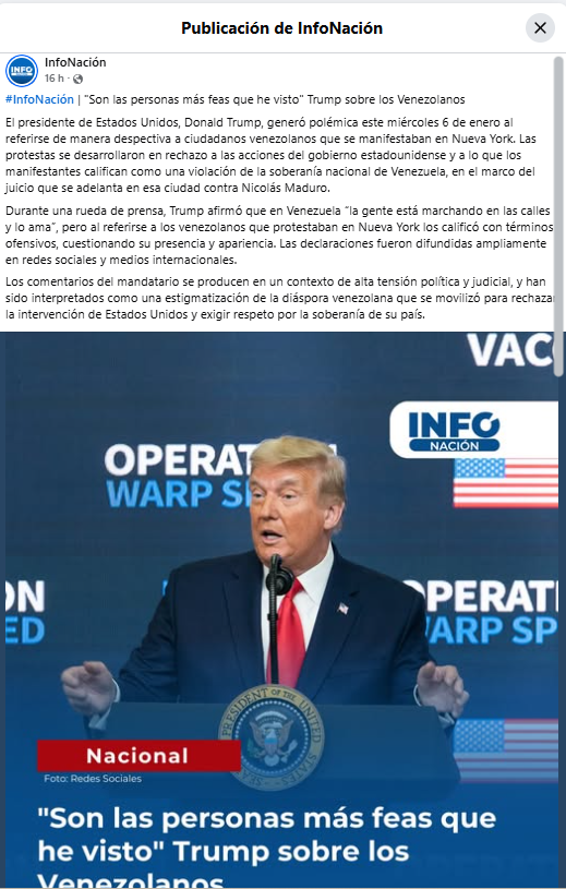En Facebook circula una publicación que afirma que Donald Trump dijo que “los venezolanos son las personas más feas que ha visto”, presentando la frase como una descalificación general hacia la población venezolana.