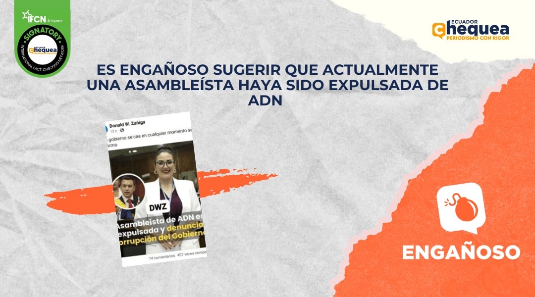Por ejemplo, una publicación en Facebook asegura que una asambleísta de ADN es expulsada y denuncia corrupción del Gobierno. Se califica este contenido como engañoso. El hecho no es actual y ocurrió meses atrás, pues la publicación intenta hacerla pasar como actual. En agosto de 2024, ADN expulsó a Fernanda Araujo tras denunciar presunto nepotismo en Chimborazo. En ese entonces, el movimiento oficialista argumentó que Araujo había emitido declaraciones en las que se evidenció una postura contraria a la del Gobierno.