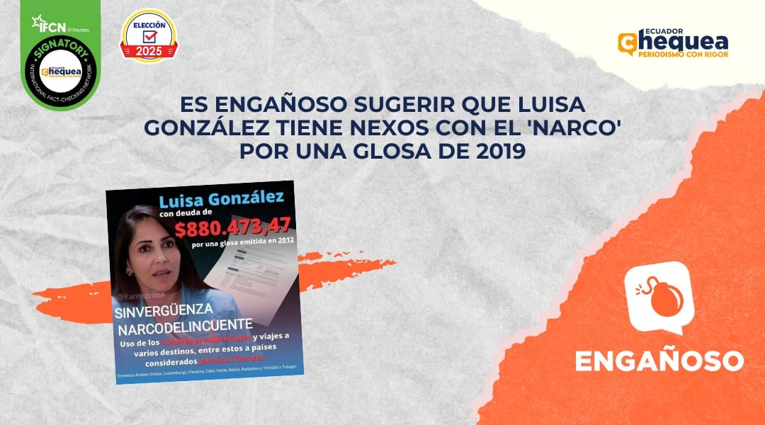 En Facebook, una publicación asegura que la candidata del correísmo, Luisa González, adeuda 880.473 dólares por una glosa de 2012; además, tanto en su gráfica como en su descripción, se da a entender que por eso González tiene un vínculo con el narcotráfico. Se califica este contenido como engañoso. El post es antiguo y circula desde 2023. Luisa González sí tiene una glosa de Contraloría, aunque la apeló y el caso está en el Contencioso Administrativo. Actualmente, se encuentra en la etapa de auto de sustanciación. El post presenta un sesgo político, porque este proceso no representa un vínculo con el narcotráfico, como se pretende dar a entender.
