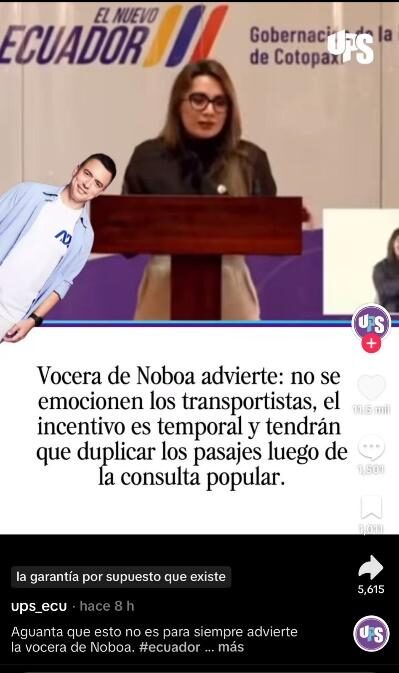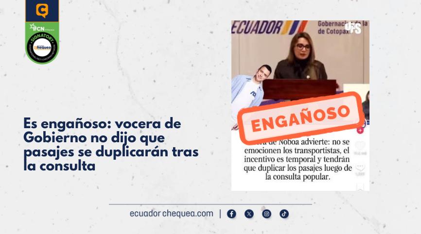 Por ejemplo, una publicación en Facebook asegura que la vocera del Gobierno, Carolina Jaramillo, declaró que, como el incentivo a los transportistas es temporal, los pasajes deberán duplicarse tras la consulta popular. Se califica este contenido como falso.
