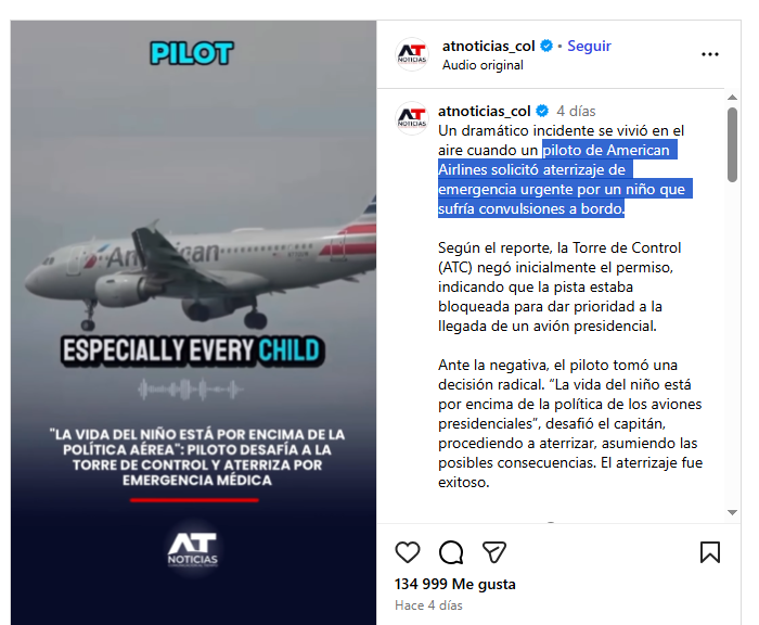 - Lo que afirma: Que un piloto de American Airlines desobedeció a la ATC para salvar a un niño con convulsiones.