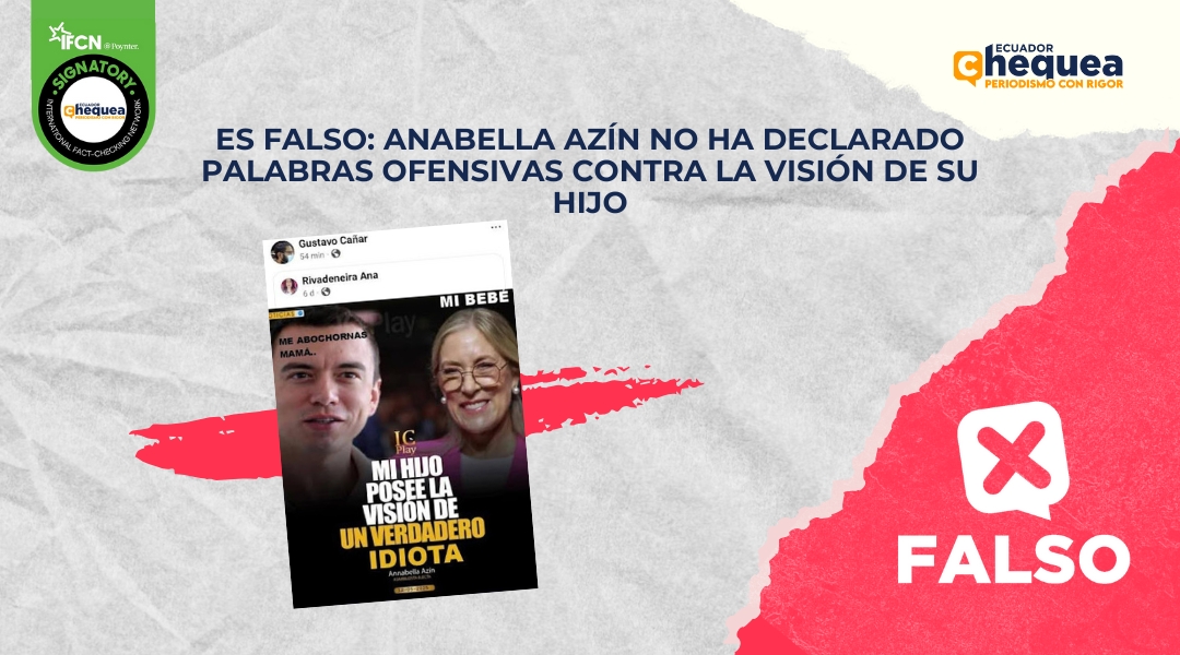 Una publicación en Facebook, asegura que Anabella Azín habría dicho: “Mi hijo posee la visión de un verdadero idiota”. Se califica este contenido como falso. Anabellla Azín no dijo lo que se le atribuye. En una entrevista con El Universo, Azín dijo que Noboa tiene “la filosofía y el espíritu de un estadista”.