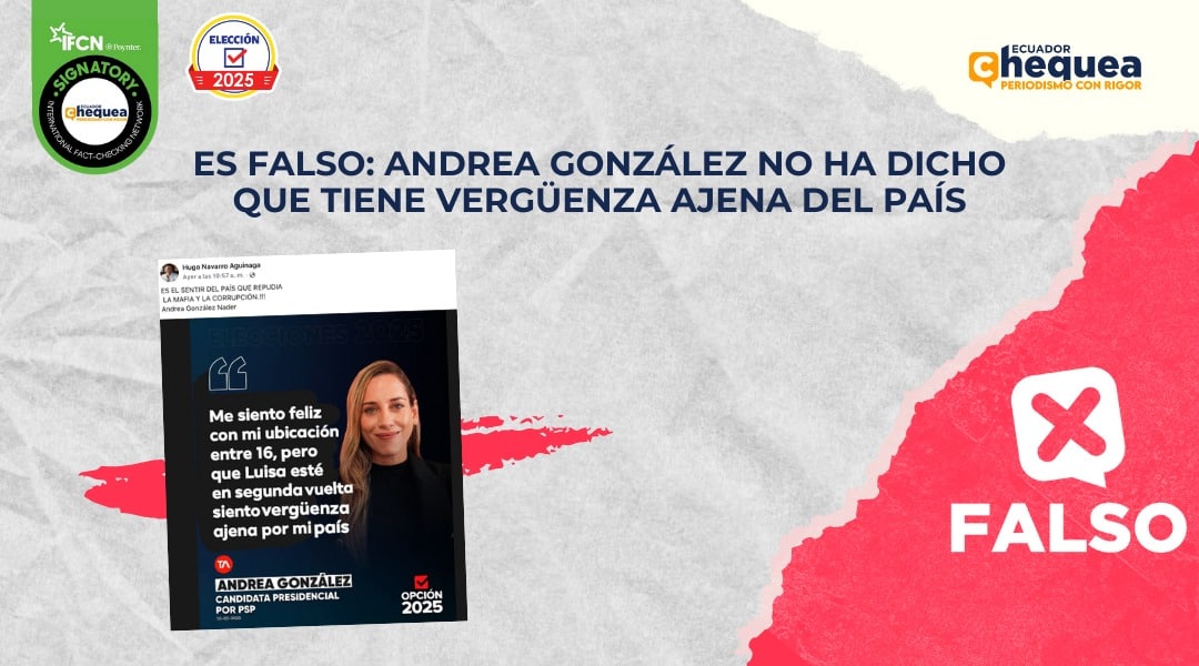Un día después de las elecciones, la excandidata Andrea González mantuvo una entrevista con Teleamazonas, donde habló sobre la primera vuelta electoral, en la que obtuvo el cuarto lugar. En ninguna parte de la entrevista se habló de que ella siente vergüenza de los ecuatorianos como quiere hacer el post.
