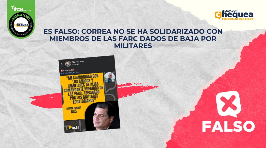 Es así como una publicación realizada en Facebook asegura que el expresidente, Rafael Correa, habría escrito una publicación en la que se solidariza con los “amigos y familiares de alias ‘Comandante’, miembro de las FARC, asesinado por los militares ecuatorianos”. El post asegura que el post fue realizado por el portal La Posta. Se califica este contenido como falso. No se encontraron registros de que el expresidente haya realizado esta publicación; ni que el portal haya compartido dicha imagen.
