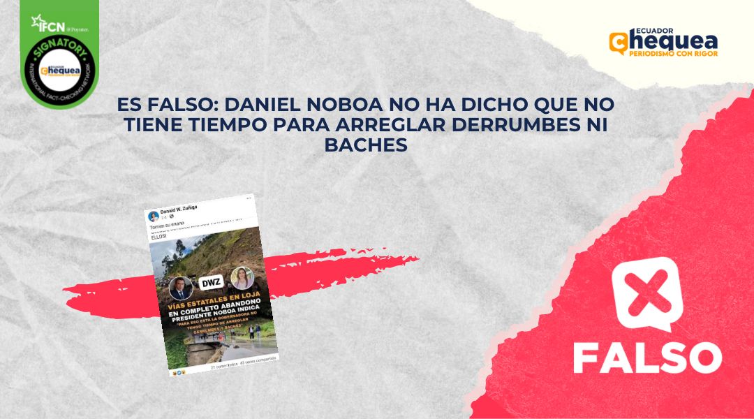 Por ejemplo, una publicación en Facebook asegura que las vías estatales en Loja están en completo abandono y que el presidente, Daniel Noboa, habría dicho que “para eso está la gobernadora, no tengo tiempo de arreglar derrumbes ni baches”. Se califica este contenido como falso. No hay declaraciones oficiales ni registros en medios donde el presidente Noboa se haya referido al estado de las vías en el país. Ningún medio de comunicación reporta la información. Noboa no ha visitado Loja desde abril de este año.
