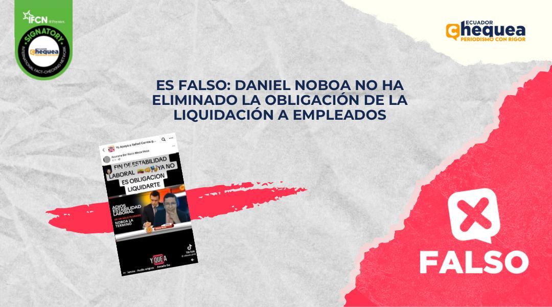 Una publicación en Facebook asegura que el presidente, Daniel Noboa, anunció el fin de la estabilidad laboral porque ya no es obligación liquidar a los empleados, debido a la aprobación de la Ley de Integridad Pública. Se califica este contenido como falso. Noboa no ha anunciado el fin de la estabilidad laboral. La Ley de Integridad Pública reformó el monto de compensación que el Estado debe pagar cuando desvincula a funcionarios.