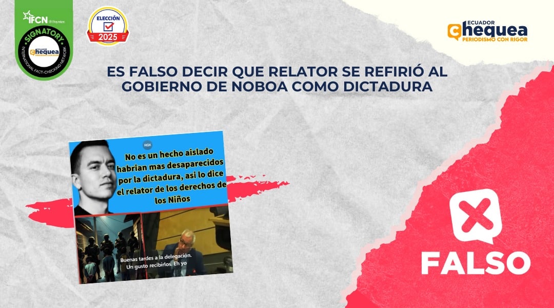 Al respecto, en Facebook, un post asegura que el Relator de Derechos de los Niños habría dicho que hay más menores desaparecidos por la dictadura del presidente- candidato, Daniel Noboa. Se califica este contenido como falso. El post presenta un claro sesgo político. La declaración está incompleta. En ninguna parte de la intervención el relator de la ONU se refirió al Gobierno de Daniel Noboa como una dictadura, aunque sí criticó el manejo que tuvo en el caso ‘Las Malvinas’ y aseguró que este no es un hecho aislado, pues según datos de la Fiscalía habría más denuncias de desaparición forzada.