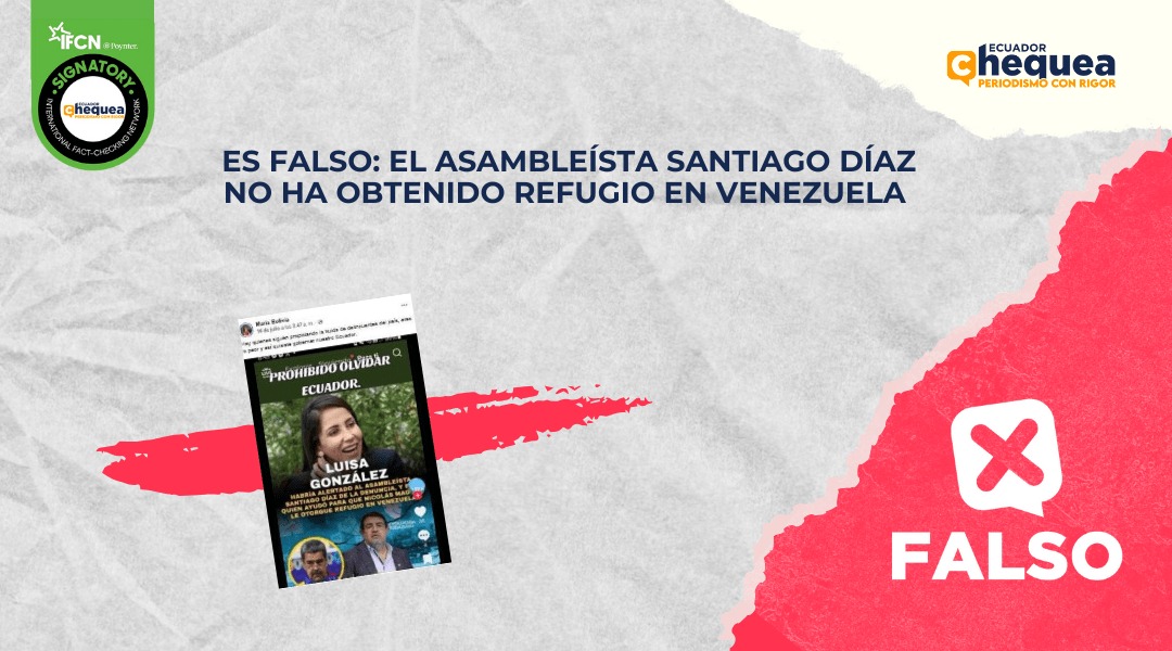 Una publicación en Facebook asegura que Santiago Díaz ha obtenido refugio en Venezuela, tras una alerta de la excandidata del correísmo, Luisa González, para que huyera. Se califica este contenido como falso. Díaz está en Ecuador y se entregó ayer a las autoridades, en Quito. No hay evidencia pública ni confirmación oficial de que González haya alertado al legislador para que busque refugio en Venezuela.