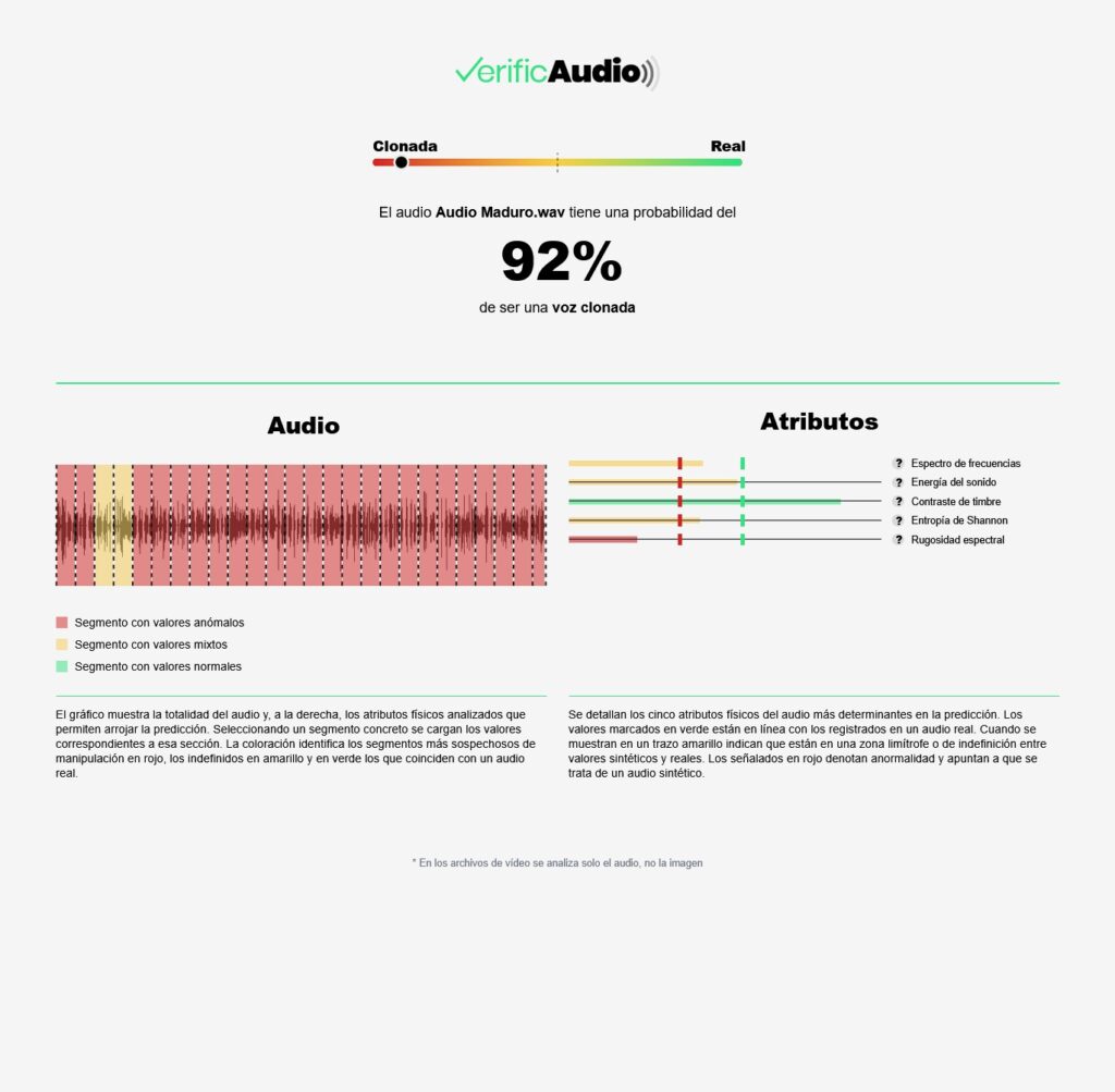 - Un análisis de la herramienta VerificAudio, para detectar la veracidad de audios al comparar con bases de datos de entrevistas radiales, encontró 92% de posibilidad de ser un audio con clonación de voz