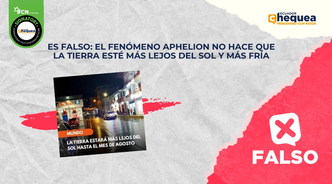Cada año este fenómeno es usado por los desinformadores para hacer de las suyas. Sobre este tema, una publicación en Facebook asegura que por “el fenómeno Aphelion, la tierra estará más lejos del sol y más fría, por lo que hay que abrigarse ya que también causa gripe, tos y dificultad para respirar”. Se califica este contenido como falso. El fenómeno se llama Afelio, ocurre en julio y no marca diferencia en el clima. No influye en las estaciones o en el clima de la Tierra. El fenómeno no provoca gripe, tos ni dificultad para respirar. La NASA asegura que la distancia del Sol no implica grandes cambios en ese sentido.