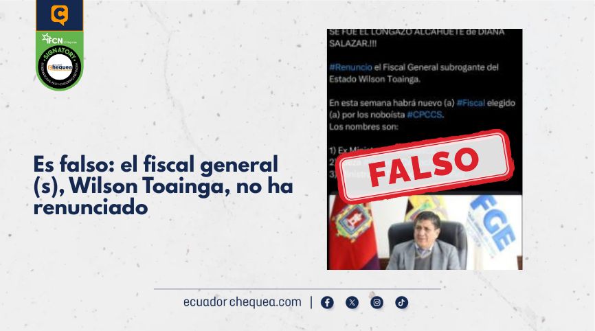 Toainga ya ha estado al frente de algunos casos de relevancia ciudadana, por lo que también ha sido un blanco de la desinformación. Al respecto, un post en X asegura que el fiscal general (s) Wilson Toainga renunció. Se califica este contenido como falso. Toainga no ha renunciado y se mantiene en sus funciones. Además, la Fiscalía desmintió el contenido.