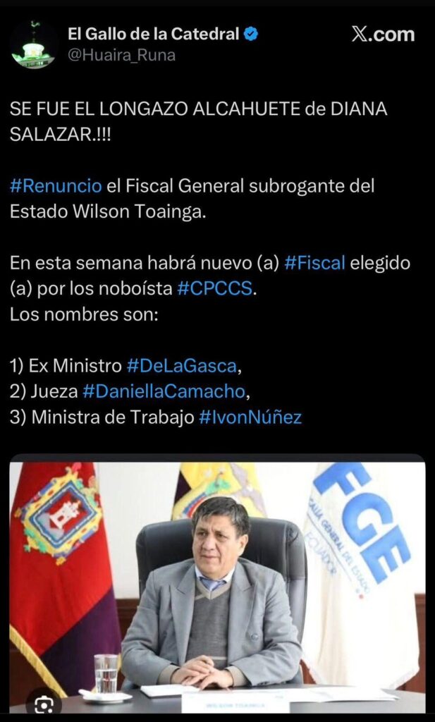 En las últimas horas circularon en redes sociales versiones que aseguraban que Wilson Toainga habría presentado su renuncia. Sin embargo, la Fiscalía, mediante su cuenta de X calificó a esas publicaciones como falsas.