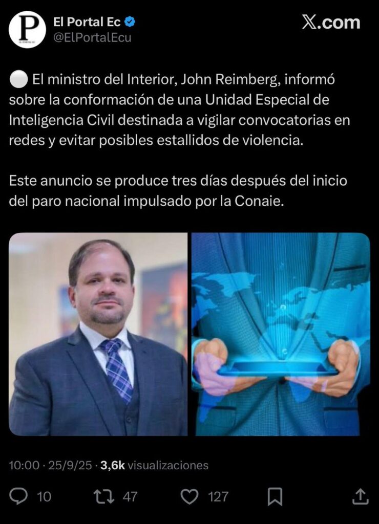 Ecuador Chequea verificó la veracidad de esta información en la entrevista brindada por Reimberg a Teleamazonas. Sin embargo, no se encontró que el funcionario haya dado declaraciones similares o vinculadas a la creación de esta unidad. De hecho, en este espacio Reimberg brinda un reporte sobre las detenciones realizadas contra manifestantes en Otavalo y sobre las acciones tomadas en la provincia, como foco del paro nacional anunciado por la Conaie.