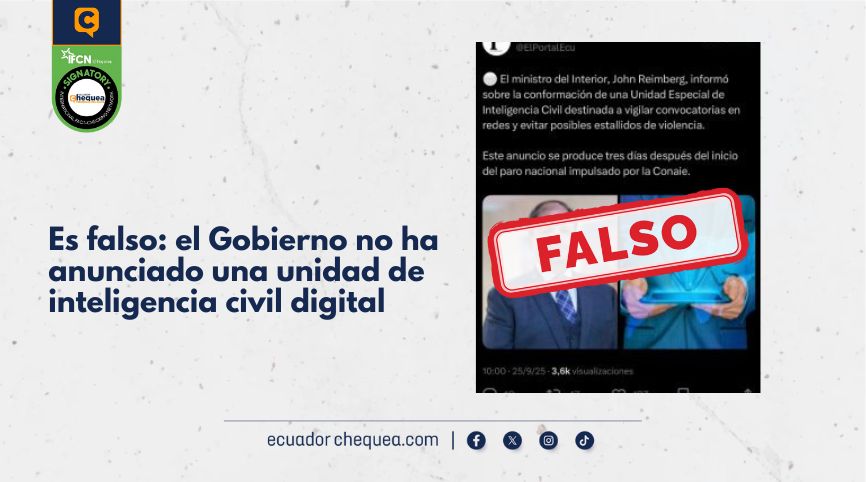 Ecuador Chequea verificó la veracidad de esta información en la entrevista brindada por Reimberg a Teleamazonas. Sin embargo, no se encontró que el funcionario haya dado declaraciones similares o vinculadas a la creación de esta unidad. De hecho, en este espacio Reimberg brinda un reporte sobre las detenciones realizadas contra manifestantes en Otavalo y sobre las acciones tomadas en la provincia, como foco del paro nacional anunciado por la Conaie.
