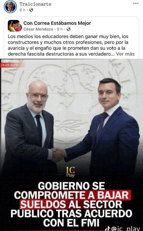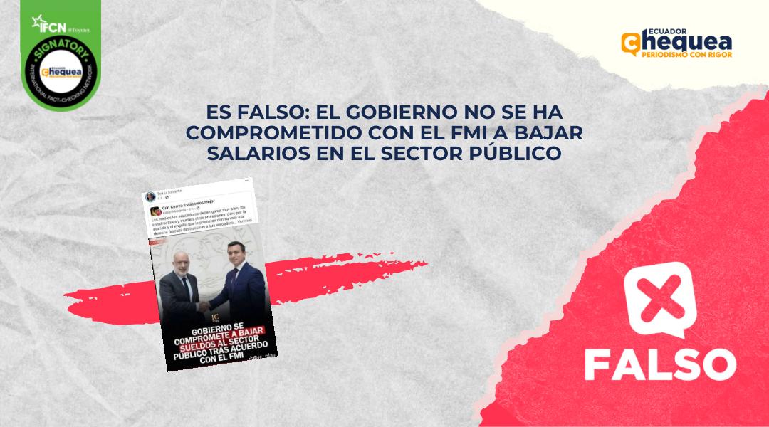 Bajo este contexto, una publicación en Facebook asegura que Daniel Noboa se comprometió con el FMI a bajar los sueldos en el sector público. Se califica este contenido como falso. El FMI propone una reducción paulatina del gasto salarial en sueldos totales entre 2025 y 2028, equivalente a un ahorro anual de 0,2 y 0,3 % del PIB, es decir entre 258 millones, dentro de un plan fiscal más amplio. No se habla de recortar los sueldos existentes de manera directa. Las medidas para lograr el ajuste incluyen limitación de nuevas plazas, eficiencia en contratación y control del crecimiento de la nómina. El Gobierno por su lado se compromete a planificar los aumentos de personal y salarios, previa evaluación para mantener la funcionalidad del Estado.