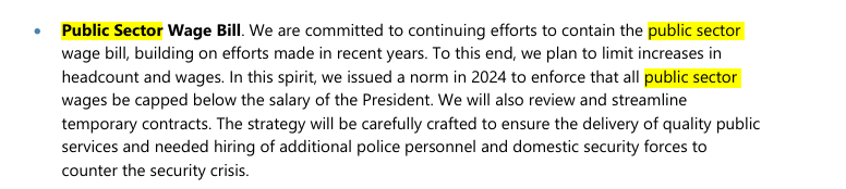 “Gasto Salarial del Sector Público: Nos comprometemos a continuar los esfuerzos para contener el gasto salarial del sector público, aprovechando los esfuerzos realizados en los últimos años. Para ello, planeamos limitar los aumentos de personal y de salarios. Con este fin, en 2024 emitimos una norma que exige que todos los salarios del sector público tengan un límite inferior al salario del Presidente. También revisaremos y optimizaremos los contratos temporales. La estrategia se elaborará cuidadosamente para garantizar la prestación de servicios públicos de calidad y la necesaria contratación de personal policial adicional y de las fuerzas de seguridad nacional para contrarrestar la crisis de seguridad”.