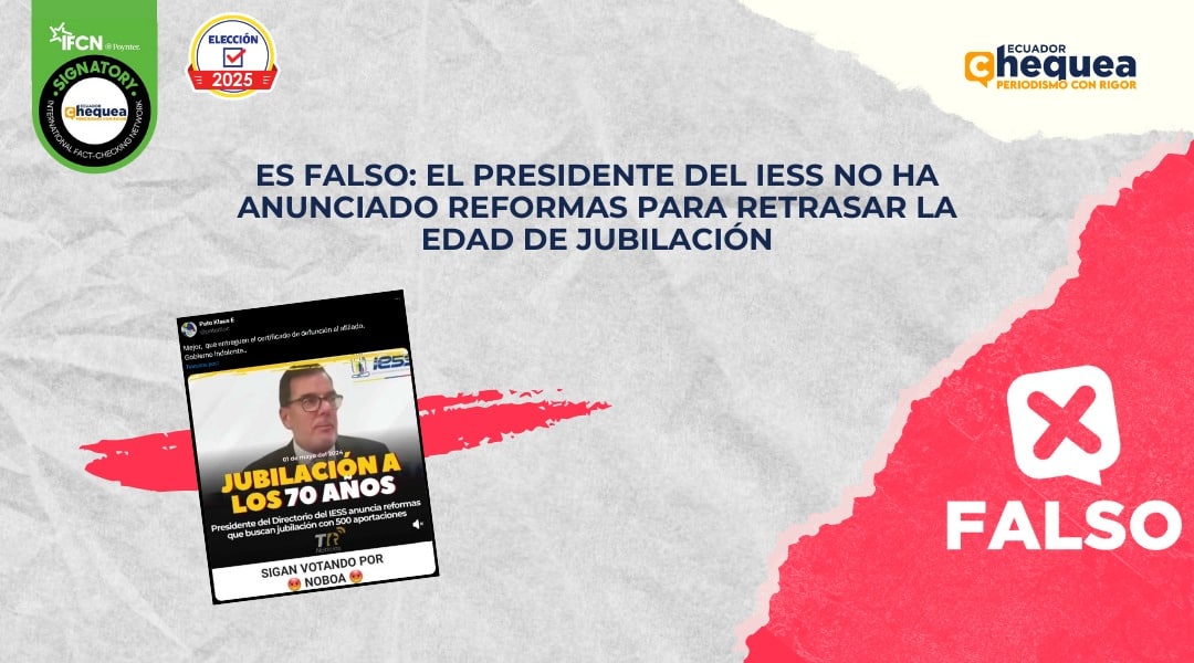 Una publicación en X. por ejemplo, asegura que el presidente del Consejo Directivo del IESS, Eduardo Peña Hurtado, anunció reformas para que la jubilación sea a los 70 años y no a los 60, como es ahora. Se califica este contenido como falso.
