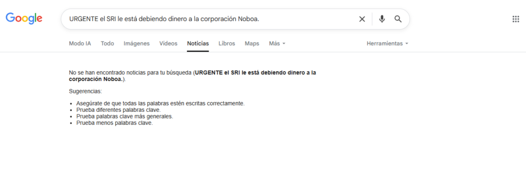 La frase desinformativa fue colocada en el buscador de Google, pero en la sección de noticias no se evidencia ninguna nota periodística al respecto.