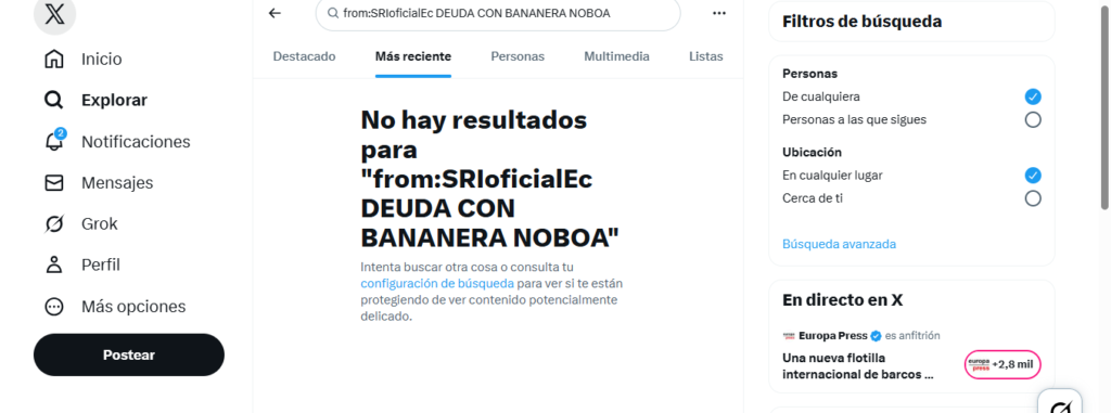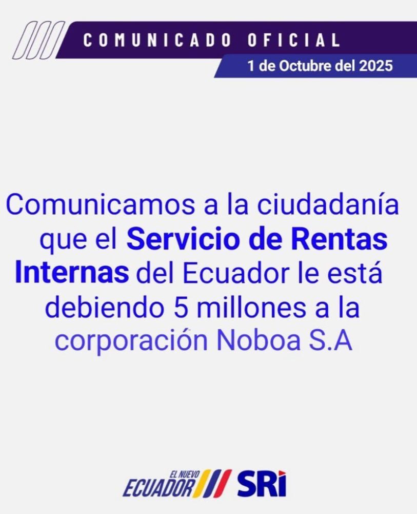 Bajo este contexto, una publicación en X asegura que, el SRI le está debiendo dinero a grupo Noboa. Esto, supuestamente, habría sido informado mediante un comunicado oficial. Se califica este contenido como falso. El SRI no tiene deudas con el grupo Noboa. El contenido usurpa los logos y tipografía de los comunicados oficiales. La entidad tributaria no ha publicado nada de lo que se le atribuye.
