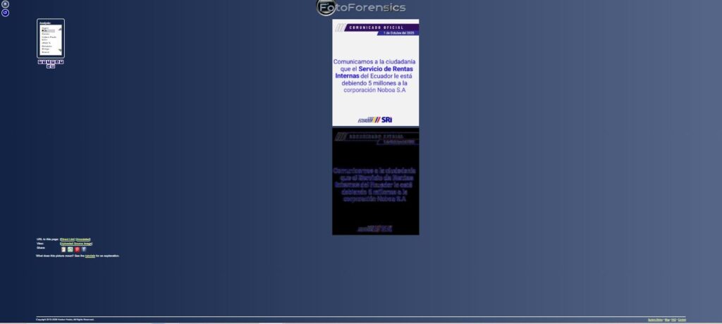 El contenido usurpa los logos y tipografía de los comunicados oficiales. El SRI no ha publicado ninguna información de lo que se le atribuye.