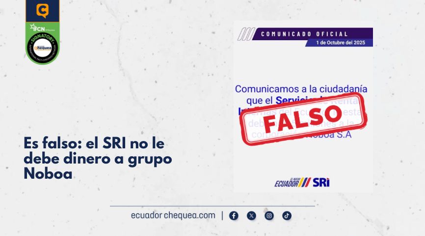 Bajo este contexto, una publicación en X asegura que, el SRI le está debiendo dinero a grupo Noboa. Esto, supuestamente, habría sido informado mediante un comunicado oficial. Se califica este contenido como falso. El SRI no tiene deudas con el grupo Noboa. El contenido usurpa los logos y tipografía de los comunicados oficiales. La entidad tributaria no ha publicado nada de lo que se le atribuye.