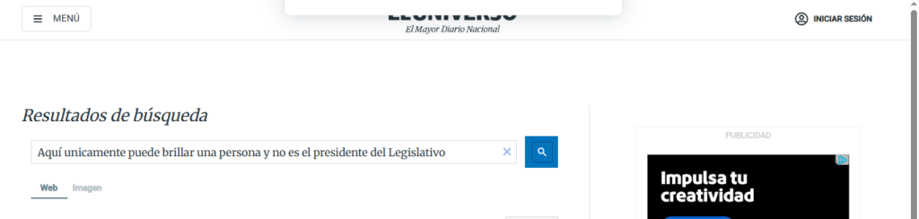 Con la misma metodología se colocó la misma frase desinformativa en la página web de El Universo, pero tampoco se encontró una nota periodística o publicación sobre el tema.