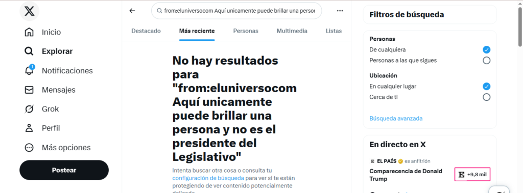 Frente a esto, se realizó una búsqueda avanzada en la cuenta de X, de diario El Universo. Sin embargo, no se encontró ninguna publicación al respecto.
