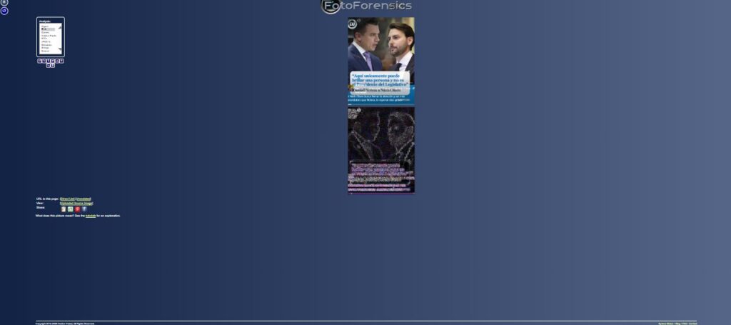 Por otro lado, la imagen desinformativa fue analizada en la herramienta de FotoForensics, que permite identificar si una fotografía ha sido editada o no. El resultado que se obtuvo en la descomposición a negro fue que las siluetas de la imagen no se marcan por completo. Cabe recordar que en una imagen sin ediciones estos elementos se marcarían totalmente; lo que no ocurre en este caso, por lo que se concluye que la imagen fue manipulada.