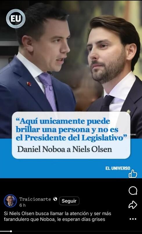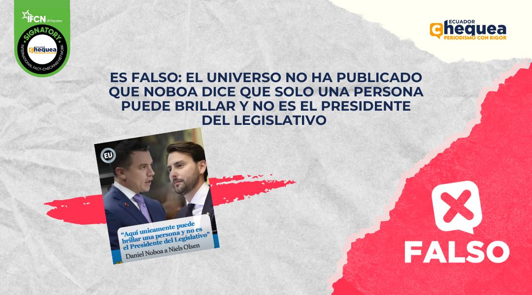 Por ejemplo, una publicación en Facebook asegura que diario El Universo habría publicado que el presidente, Daniel Noboa, dijo que hay una sola persona que puede brillar y no es el Presidente de la Asamblea. Se califica este contenido como falso. Noboa no ha dicho lo que se le atribuye. No hay declaraciones oficiales ni registros en medios confiables donde el Presidente haya dicho la supuesta declaración. El post tampoco fue publicado por El Universo y usurpa sus logos y tipografía.