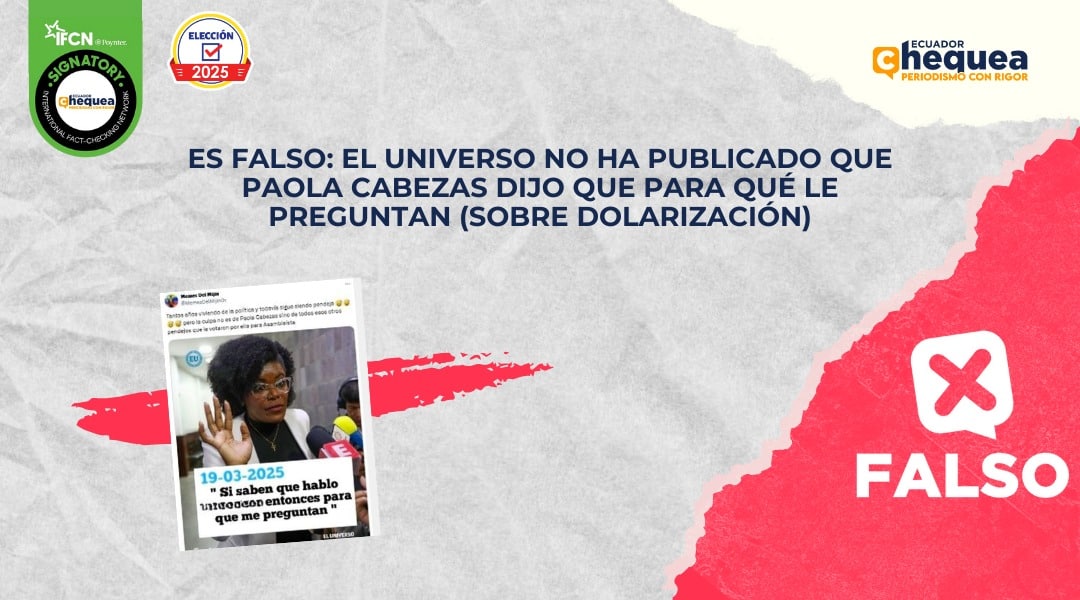 Sobre el tema, circula en una publicación en X que asegura que la asambleísta del correísmo Paola Cabezas habría dicho: “Si saben que (sobre dolarización), entonces para qué me preguntan”. Esto atribuido a diario El Universo. Se califica este contenido como falso. El medio no publicó lo que se le atribuye. El post desinformador tenía contenido ofensivo, que hemos quitado. La publicación está editada. Además, Cabezas tampoco dio esa declaración. El miércoles, El Universo publicó que la legisladora explicó su afirmación dada en un programa sobre una dolarización a la ecuatoriana.