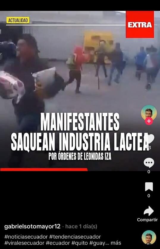 Bajo ese contexto, una publicación en TikTok asegura que Extra publicó que manifestantes saquearon una industria láctea por orden de Leonidas Iza. Se califica este contenido como falso. Extra no publicó lo que se le atribuye. No hay registro de ese post en las cuentas oficiales del medio. El video que usa el contenido no es actual y corresponde al paro de 2019. En ese entonces, varios medios compartieron el clip.