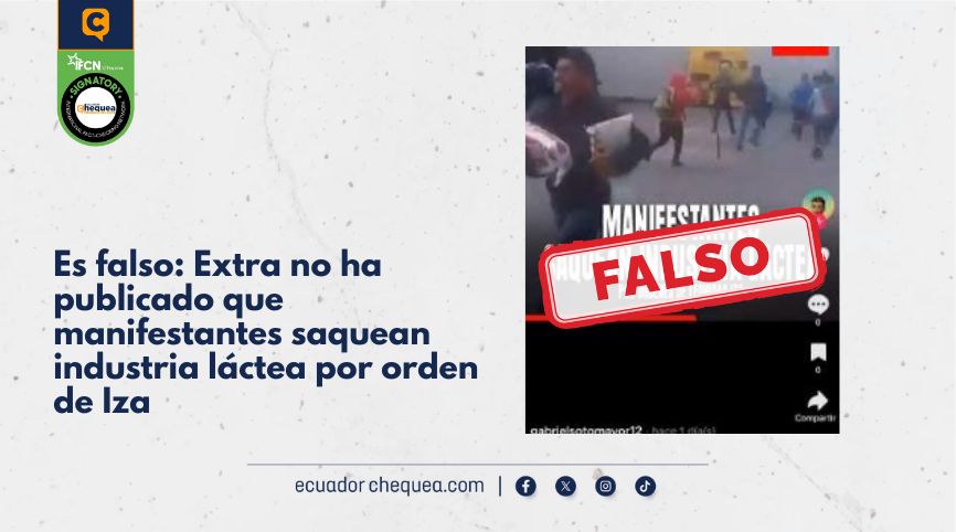 Bajo ese contexto, una publicación en TikTok asegura que Extra publicó que manifestantes saquearon una industria láctea por orden de Leonidas Iza. Se califica este contenido como falso. Extra no publicó lo que se le atribuye. No hay registro de ese post en las cuentas oficiales del medio. El video que usa el contenido no es actual y corresponde al paro de 2019. En ese entonces, varios medios compartieron el clip.