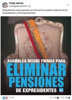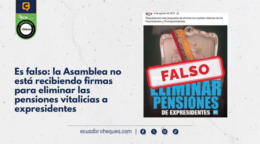 En Facebook, por ejemplo, una publicación asegura que la Asamblea está recibiendo firmas para eliminar las pensiones vitalicias a expresidentes. Se califica este contenido como falso. Actualmente, no se están recibiendo firmas para eliminar las pensiones vitalicias. El contenido hace pasar una publicación como actual. Fue publicada en julio de 2019, por El Comercio.
