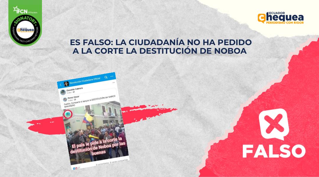 Al respecto, una publicación en Facebook asegura que la ciudadanía le pide a la Corte Constitucional la destitución del presidente, Daniel Noboa. Se califica este contenido como falso. No hay registros de que los ciudadanos pidan a la Corte la destitución de Noboa. La imagen circula desde hace 8 meses. Además, los ciudadanos no pueden pedir directamente la destitución del Presidente. La destitución o juicio político sólo puede ser iniciado por un tercio de la Asamblea, con intervención de la Corte Constitucional y votación de dos tercios.