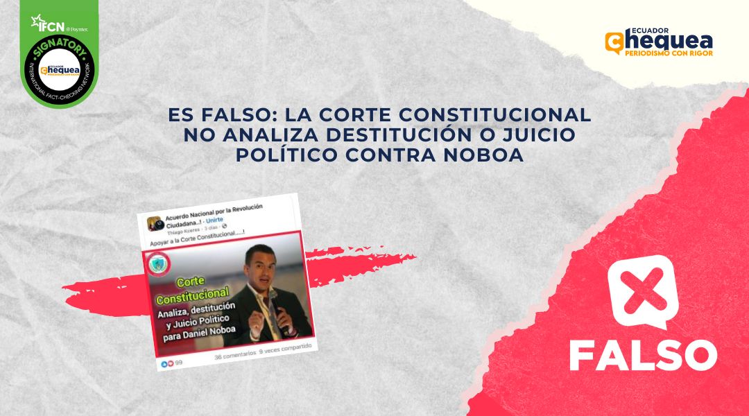 Bajo este contexto, la desinformación no se ha hecho esperar. Una publicación en Facebook asegura que la Corte Constitucional está analizando una destitución o juicio político contra Daniel Noboa. Se califica este contenido como falso. La Corte Constitucional no puede juzgar ni destituir al Presidente, pues esa no es su competencia. Sólo la Asamblea, previa autorización de la Corte, puede hacerlo y desde el Legislativo por una sola vez, en los tres primeros años del mismo, según manda la Constitución. Además, la Corte es un órgano de control de constitucionalidad. Es decir, interpreta la Constitución, controla la constitucionalidad de leyes, tratados y actos del poder público, y resuelve acciones de inconstitucionalidad o garantías constitucionales.